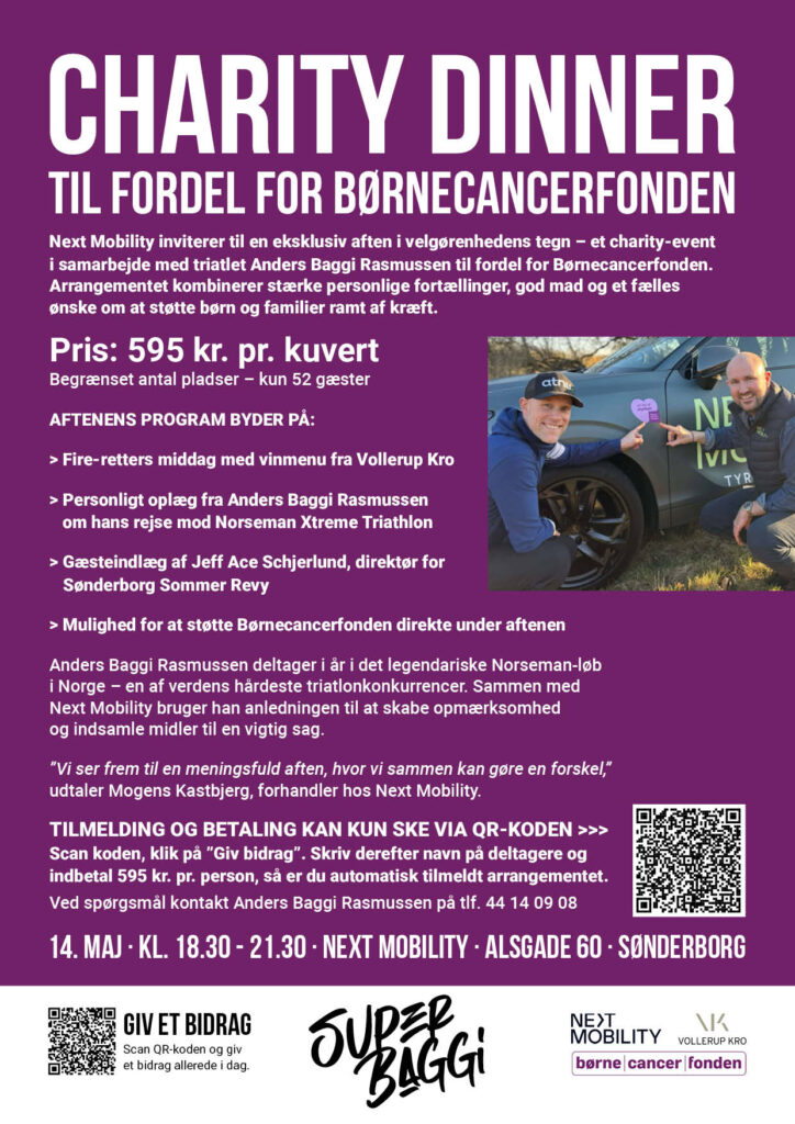 Den 14. maj inviterer Next Mobility til en ganske særlig aften i Sønderborg. En aften, hvor god mad, stærke historier og et fælles ønske om at gøre en forskel går hånd i hånd. Sammen med triatleten Anders Baggi Rasmussen afholder Next Mobility en eksklusiv charity dinner til fordel for Børnecancerfonden – og du har mulighed for at være med.